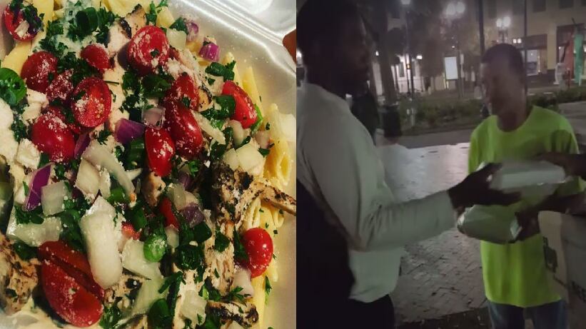 In the video, some of the workers gave food in to-go boxes to homeless individuals at the Jacksonville Landing and Hemming Park.