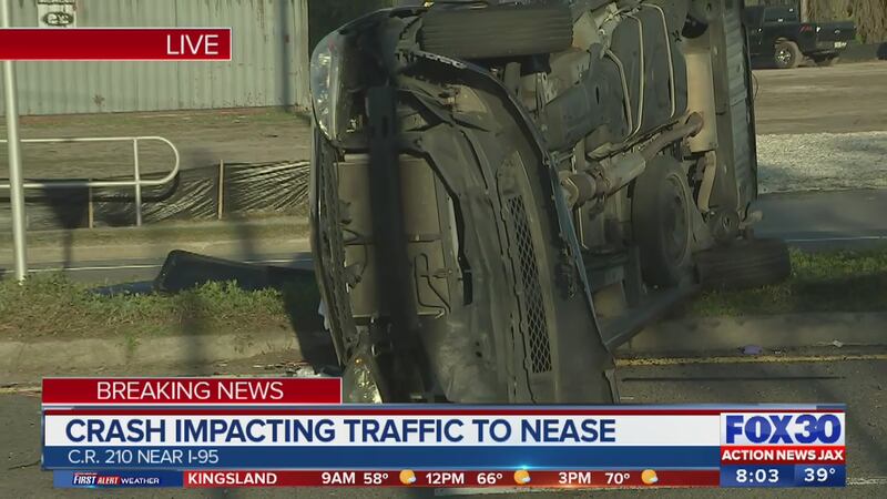 A trooper on the scene tells me the woman driving the overturned SUV is at the hospital with serious injuries. EB traffic on CR 210 is now being diverted around crash. @ActionNewsJax @WOKVNews pic.twitter.com/z8LSibw1xe