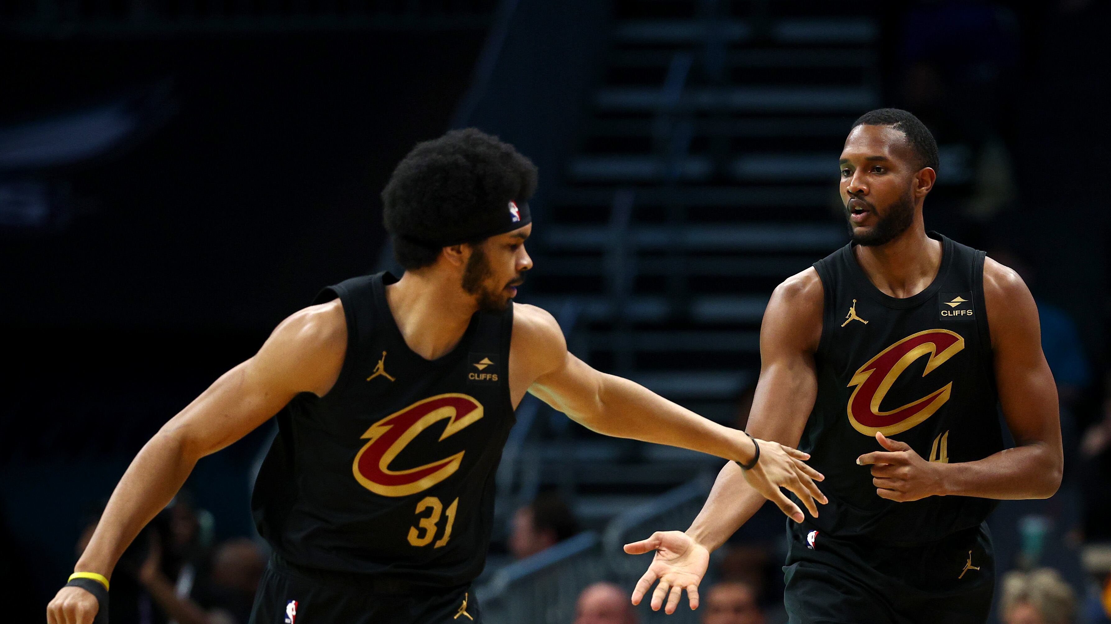 Cleveland Cavaliers v Charlotte Hornets CHARLOTTE, NORTH CAROLINA - MARCH 27: Jarrett Allen #31and Evan Mobley #4 of the Cleveland Cavaliers react during the first half of the game against the Charlotte Hornets at Spectrum Center on March 27, 2024 in Charlotte, North Carolina. NOTE TO USER: User expressly acknowledges and agrees that, by downloading and or using this photograph, User is consenting to the terms and conditions of the Getty Images License Agreement. (Photo by Jared C. Tilton/Getty Images) (Jared C. Tilton/Getty Images)