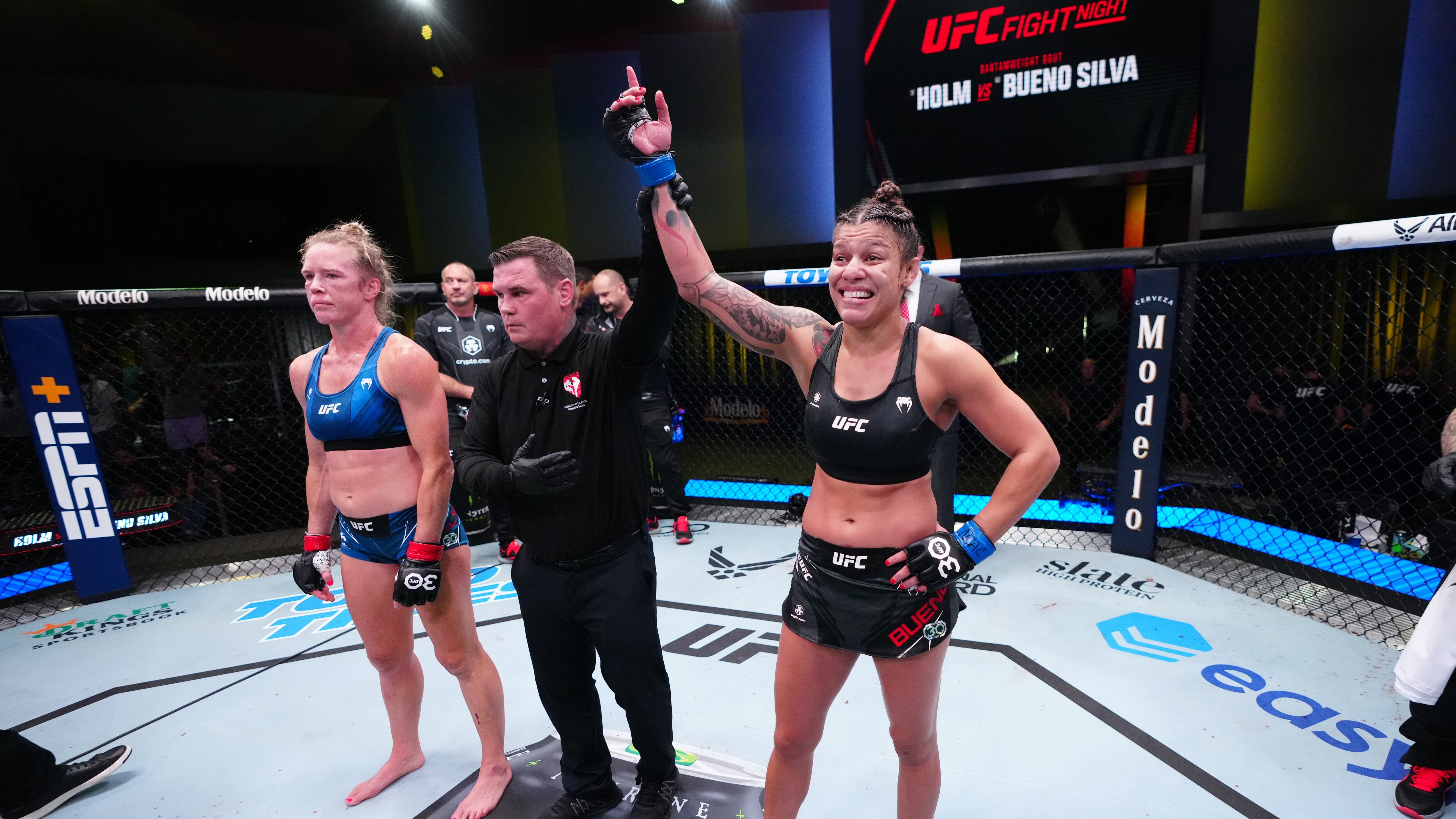 With the win, Buena Silva, 31, improves to 11-2-1 in MMA including a 6-2-1 UFC record. The win was her fourth straight in the UFC and her third straight submission. She's now tied with No. 2 Raquel Pennington for the longest win streak in the division.