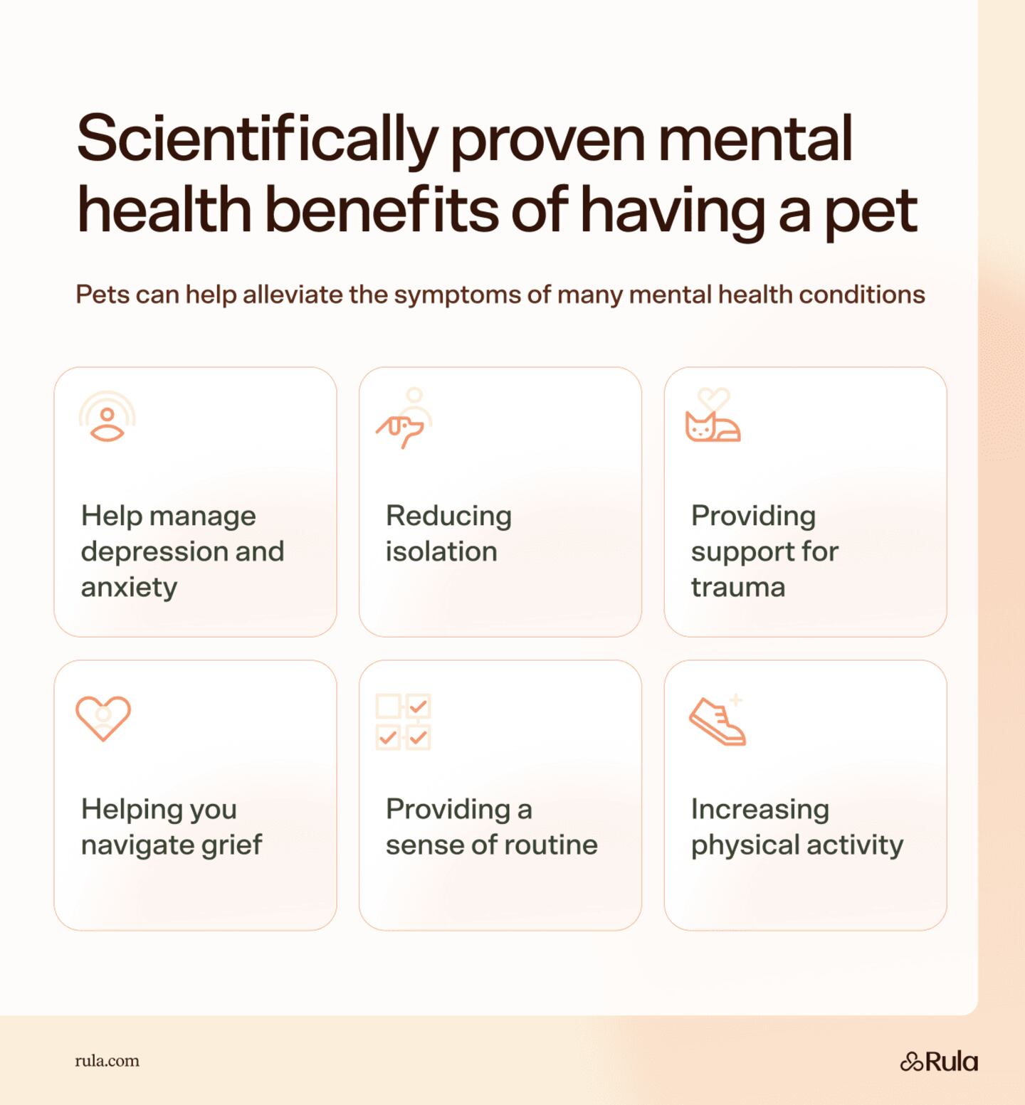 • Research shows many mental health benefits to having a pet. Pet ownership has been proven to help people living with conditions like depression, anxiety, PTSD, ADHD, autism, and more.