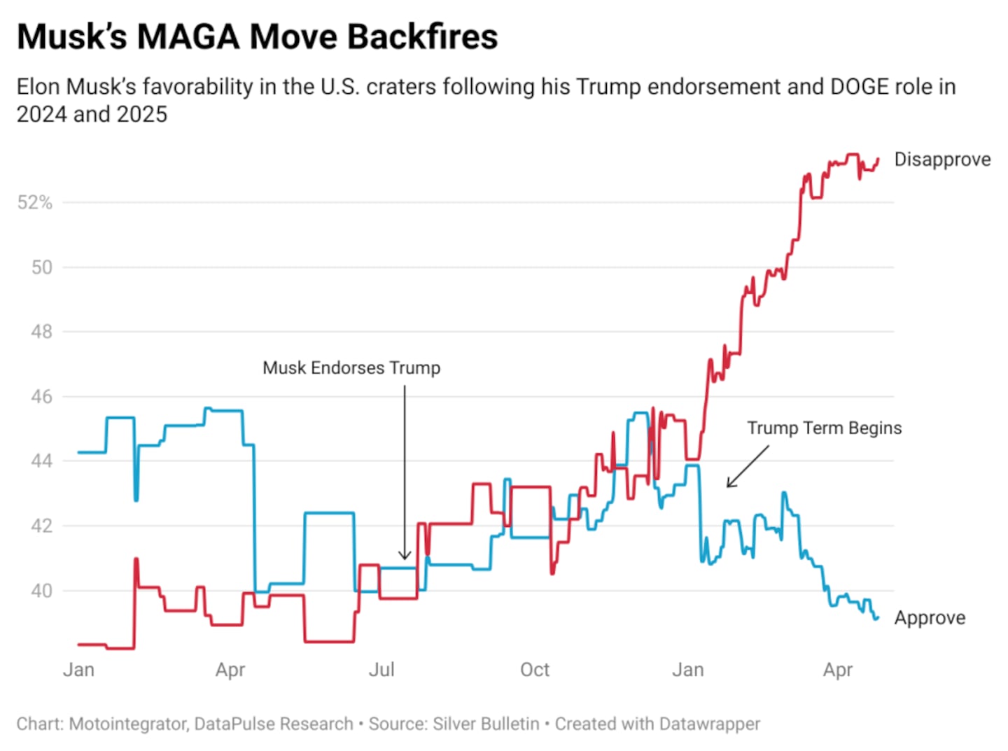 There are several factors driving Tesla's decline, but consumer sentiment appears to play a key role. Recent U.S. public opinion polls underscore this point: Elon Musk's approval ratings dropped sharply following his endorsement of Donald Trump in mid-2024. By early 2025, disapproval had overtaken approval.