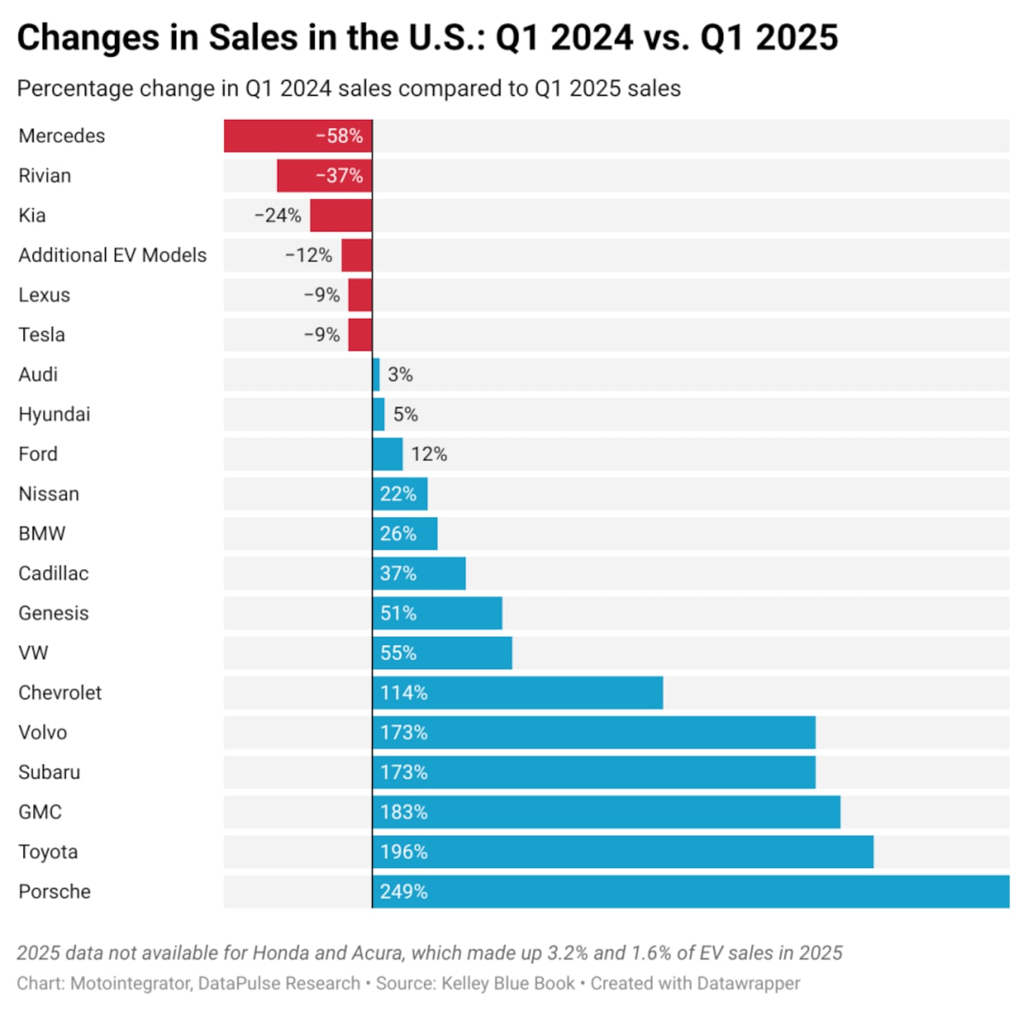 New data shows that Tesla’s decline is specific to its brand. In Q1 2025, Tesla’s U.S. sales dropped by 9% year-over-year, while competitors experienced substantial growth. Porsche (+249%), Toyota (+196%), GMC (+183%), and Volvo (+173%) led with triple-digit increases. Legacy automakers like Chevrolet (+114%), Ford (+12%), and Volkswagen (+55%), also outpaced Tesla.