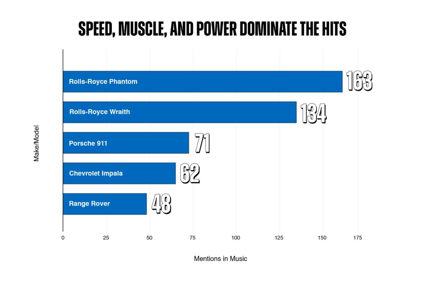 You might not expect a hyperluxury car like the Rolls-Royce Phantom to dominate musical mentions, but it appears in 163 songs, followed closely by the Rolls-Royce Wraith with 134 musical cameos. It makes sense in the context of modern hip-hop and R&B, which often use ultra-luxury cars as symbols of accomplishment and wealth.