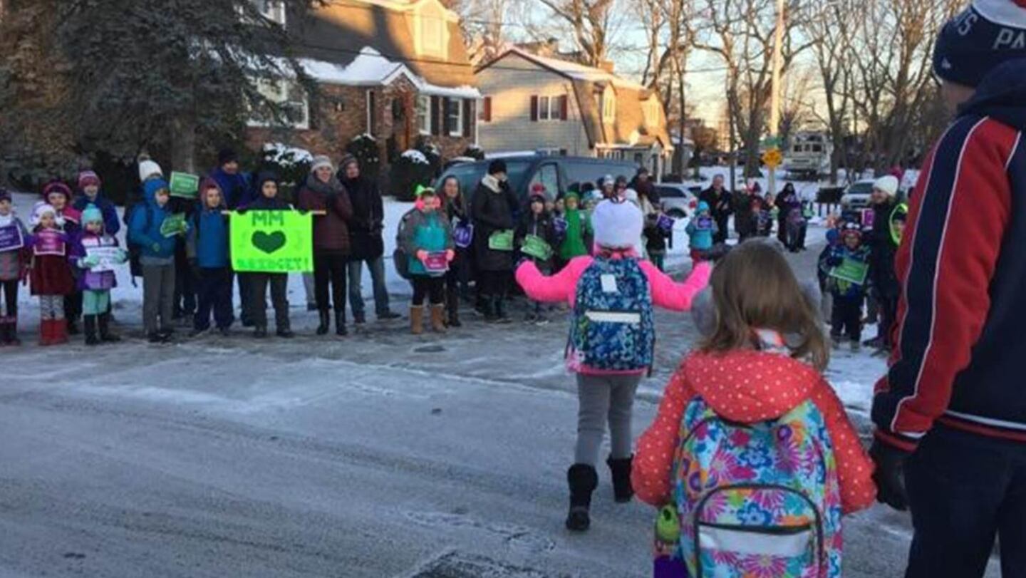 Bridget was met by hundreds of students, parents, teachers and police officers, all braving temperatures at 4-degrees to hold signs of welcome and encouragement for the third-grader, the "Today" show reported.