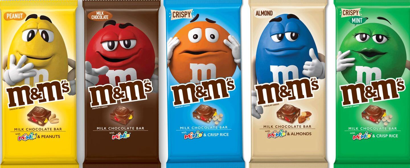 M&M's Chocolate Bars feature M&M's minis spread throughout a milk chocolate bar. The bars will come in five varieties: Peanut, Milk Chocolate, Crispy, Almond and Crispy Mint. The bars will be available beginning December 2018, M&M's said in a news release.