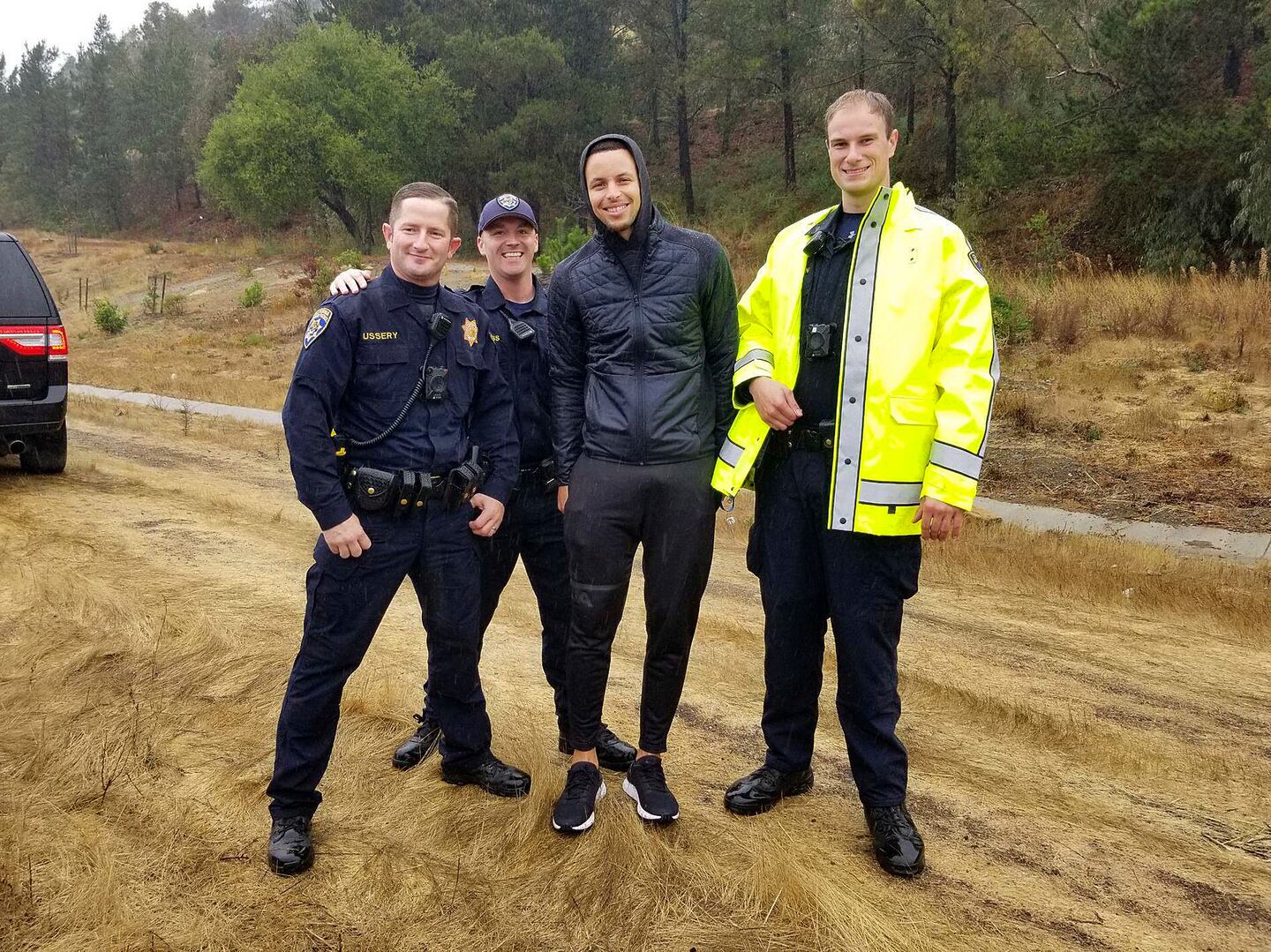 NBA Golden State Warriors basketball star Stephen Curry, second from right, poses with CHP Officers, from left, Ussery, Childress and Anderson, after two drivers hit Curry's car on an Oakland, Calif., freeway Friday morning, Nov. 23, 2018. Photo: California Highway Patrol Oakland/Via AP