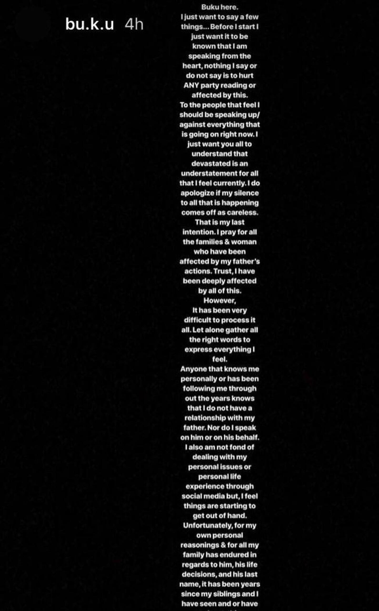 "The same monster you all confronting me about is my father," Buku added. "I am well aware of who and what he is. I grew up in that house. My choice to not speak on him and what he does is for my peace of mind. My emotional state. And for MY healing. I have to do & move in a manner that is best for me. I pray anyone who reads this understands I put nothing but good intent behind each word.
