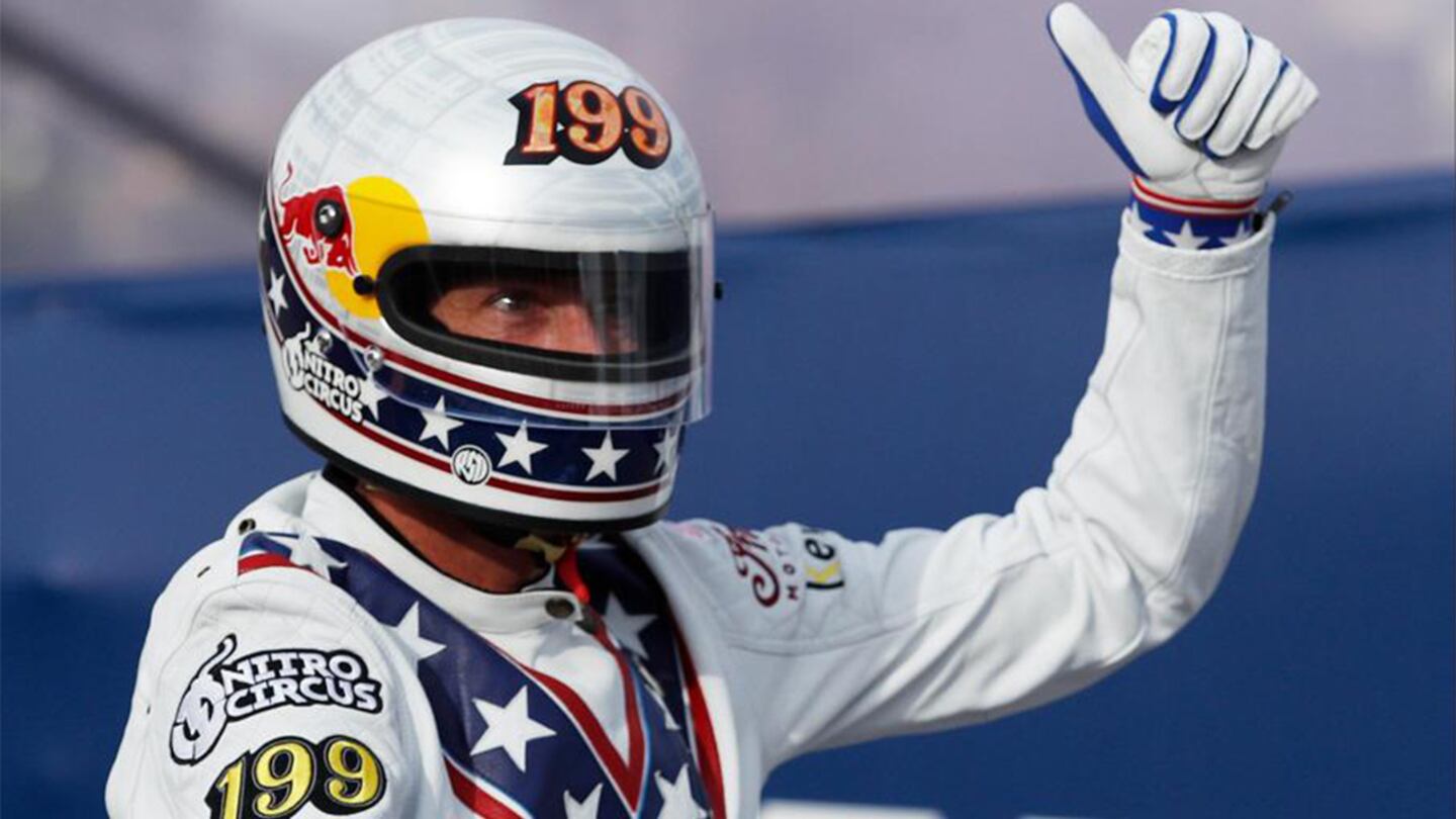 Dressed in Knievel’s trademark red, white and blue, Pastrana used a heavy, track-like bike for the stunt.