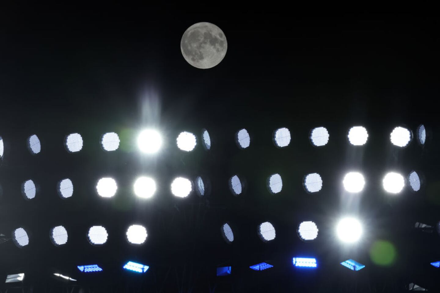 Blue Supermoon LOS ANGELES, CALIFORNIA - AUGUST 30: A super blue moon is seen above the stadium lights during the baseball game between the Arizona Diamondbacks and the Los Angeles Dodgers at Dodger Stadium on August 30, 2023 in Los Angeles, California. (Photo by Kevork Djansezian/Getty Images) (Kevork Djansezian/Getty Images)