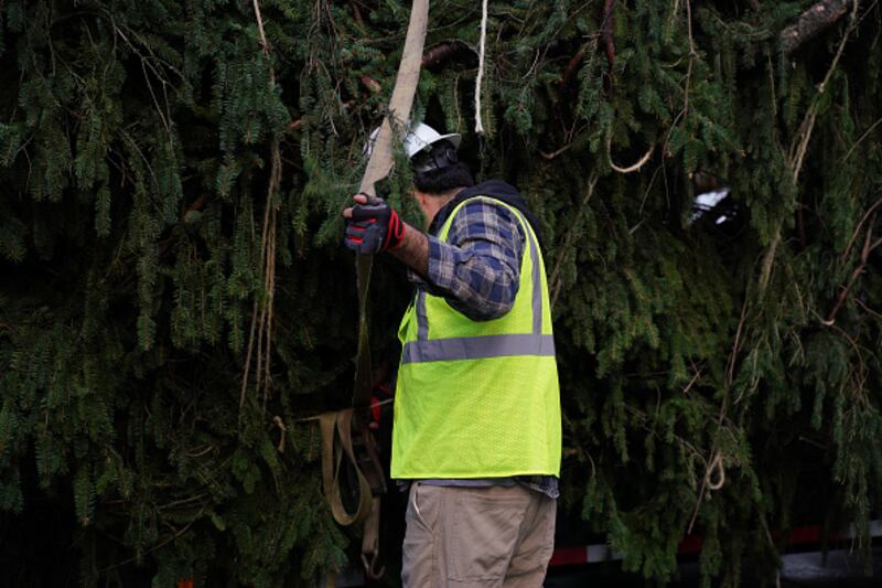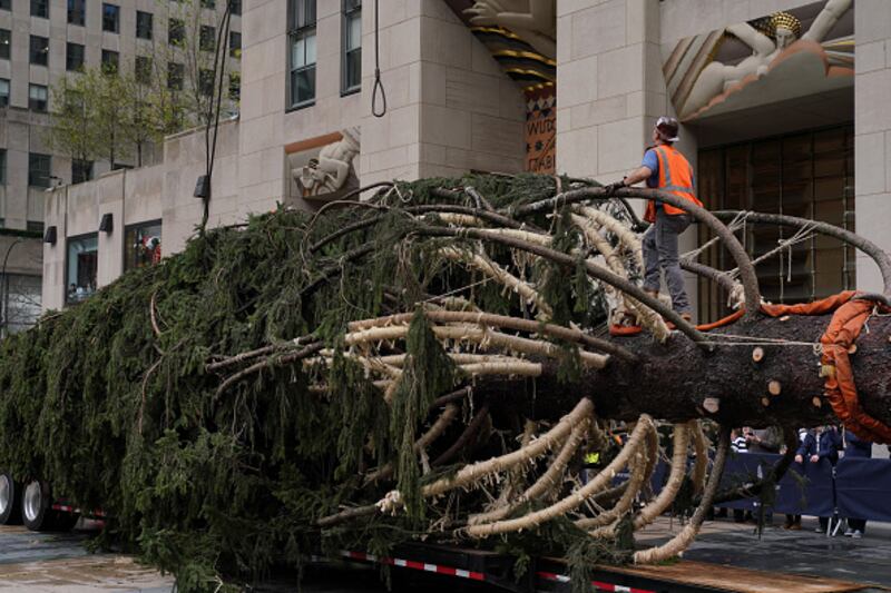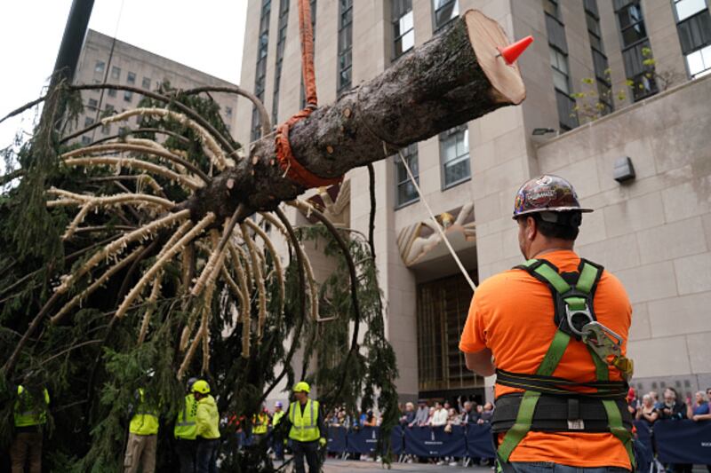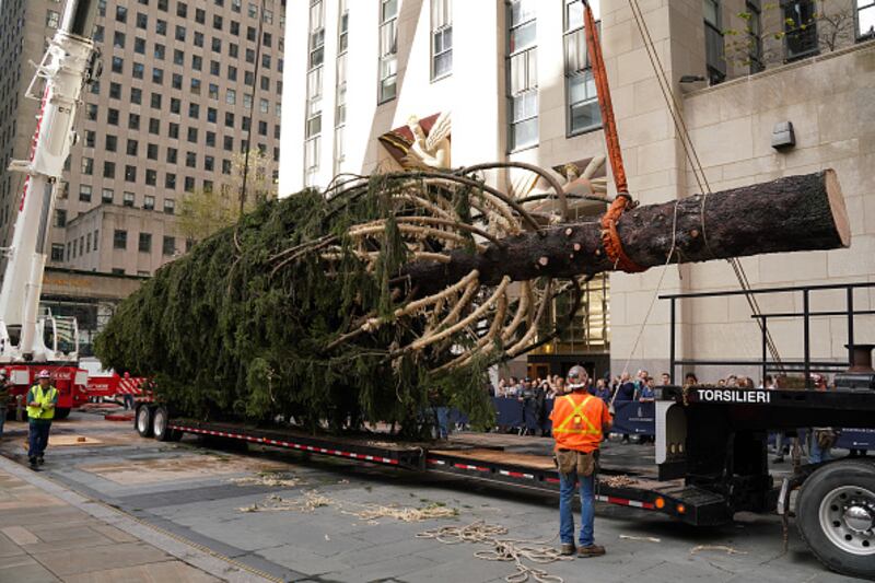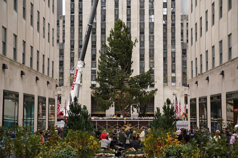 2022 Rockefeller Center Christmas tree arrives NEW YORK, NY - NOVEMBER 12: The Rockefeller Center Christmas tree was lifted into place after arriving in the plaza in New York City on Saturday, Nov. 12, 2022. About 100 spectators watched the lifting process of the 82-foot tall, 90-year-old Norway Spruce in the morning despite the rain. (Photo by Lokman Vural Elibol/Anadolu Agency via Getty Images) (Anadolu Agency/Anadolu Agency via Getty Images)