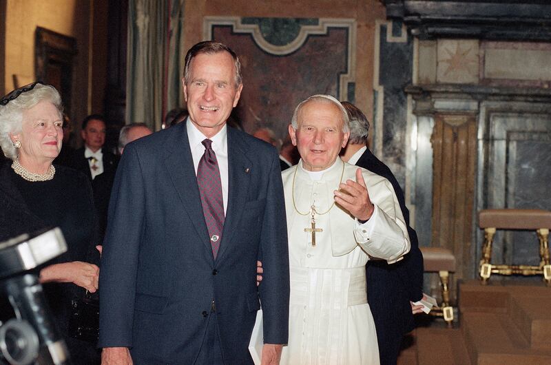 Photos: Popes' meetings with US presidents 1991: In this Nov. 8, 1991, file photo Pope John Paul II invites U.S. President George Bush, accompanied by his wife, Barbara, to meet members of the clergy gathered in the Vatican's Clementine Hall. The President and the Pope met after the President attended the NATO Summit in Rome. (AP Photo/Denis Paquin, File)