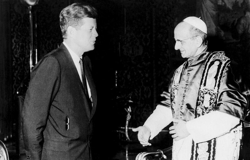 Photos: Popes' meetings with US presidents 1963: In this July 2, 1963, file photo, President John F. Kennedy and Pope Paul VI talk at the Vatican. Kennedy's meeting with Pope Paul VI at the Vatican was historic: The first Roman Catholic president of the United States was seeing the Roman Catholic pontiff only days after his coronation. (AP Photo, File)