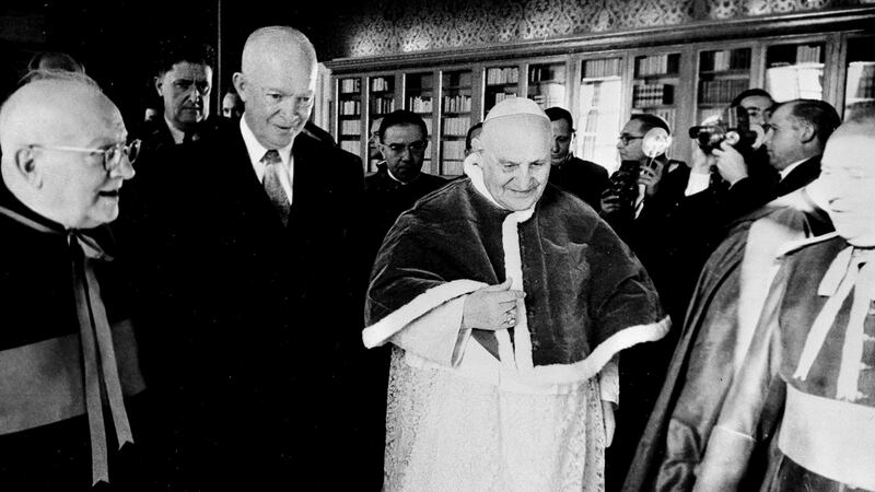 Photos: Popes' meetings with US presidents 1959: In this Dec. 6, 1959, file photo, President Dwight D. Eisenhower walks with Pope John XXIII at the Vatican. (AP Photo/Paul Schutzer, File)