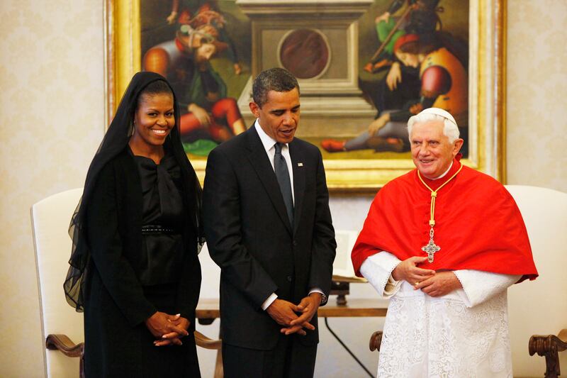 Photos: Popes' meetings with US presidents 2009: In this July 10, 2009, file photo, President Barack Obama and first lady Michelle Obama meet with Pope Benedict XVI at the Vatican. (AP Photo/Haraz N. Ghanbari)