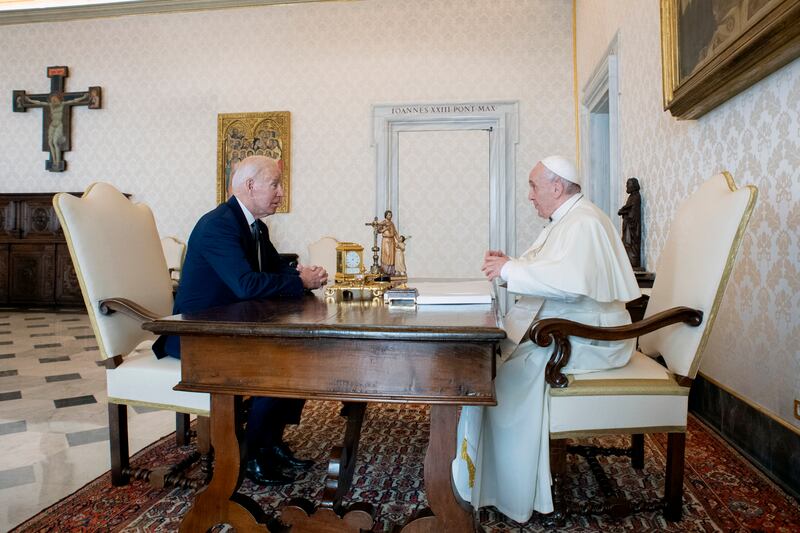 Biden meets with Pope Francis at the Vatican US President Joe Biden, left, talks with Pope Francis as they meet at the Vatican on Friday, Oct. 29, 2021. (Vatican Media via AP)