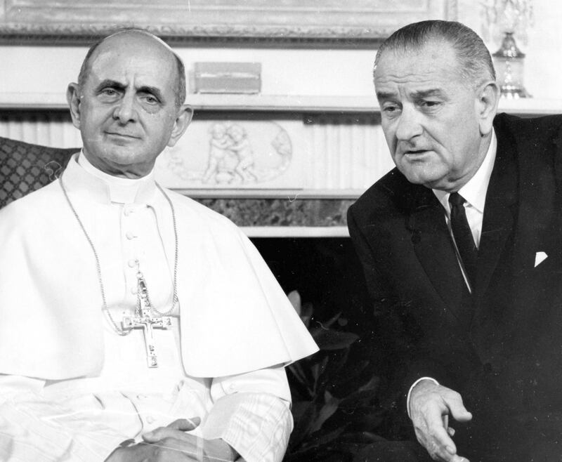 Photos: Popes' meetings with US presidents 1965: In this Oct. 4, 1965, file photo, Pope Paul VI, left, and President Lyndon B. Johnson are seen during the Pontiff's visit to New York. The trip presented protocol problems. Johnson wanted to see him, but the pontiff was a chief of a state not officially recognized by the U.S. The solution: Johnson flew to New York for dinner at the apartment of his friend Arthur Goldberg, the U.S. ambassador to the United Nations, and the pontiff was welcomed to Johnson's suite at the Waldorf-Astoria Hotel the next day. (AP Photo, File)
