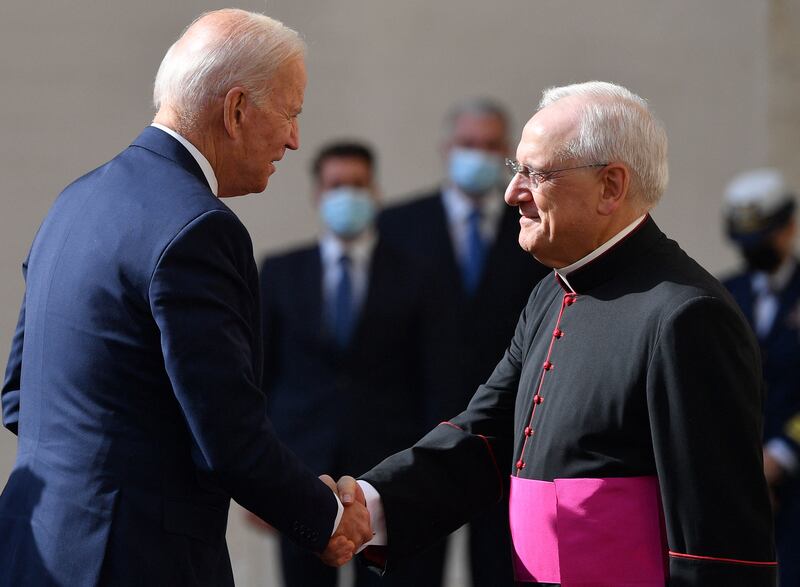 Photos: Biden arrives at Vatican for meeting with Pope Francis Monsignor Leonardo Sapienza, Italian priest, greets President Joe Biden as he arrives at San Damaso courtyard in the Vatican on October 29, 2021, for a private audience with the Pope. (TIZIANA FABI/AFP via Getty Images)