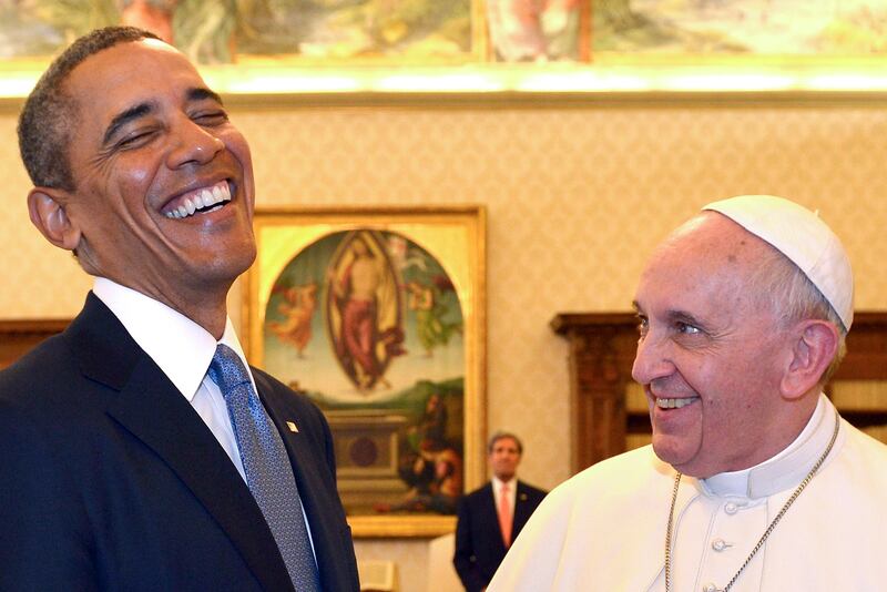 Photos: Popes' meetings with US presidents 2014: In this March 27, 2014, file photo, Pope Francis and President Barack Obama smile as they meet at the Vatican. (AP Photo/Gabriel Bouys, Pool, File)