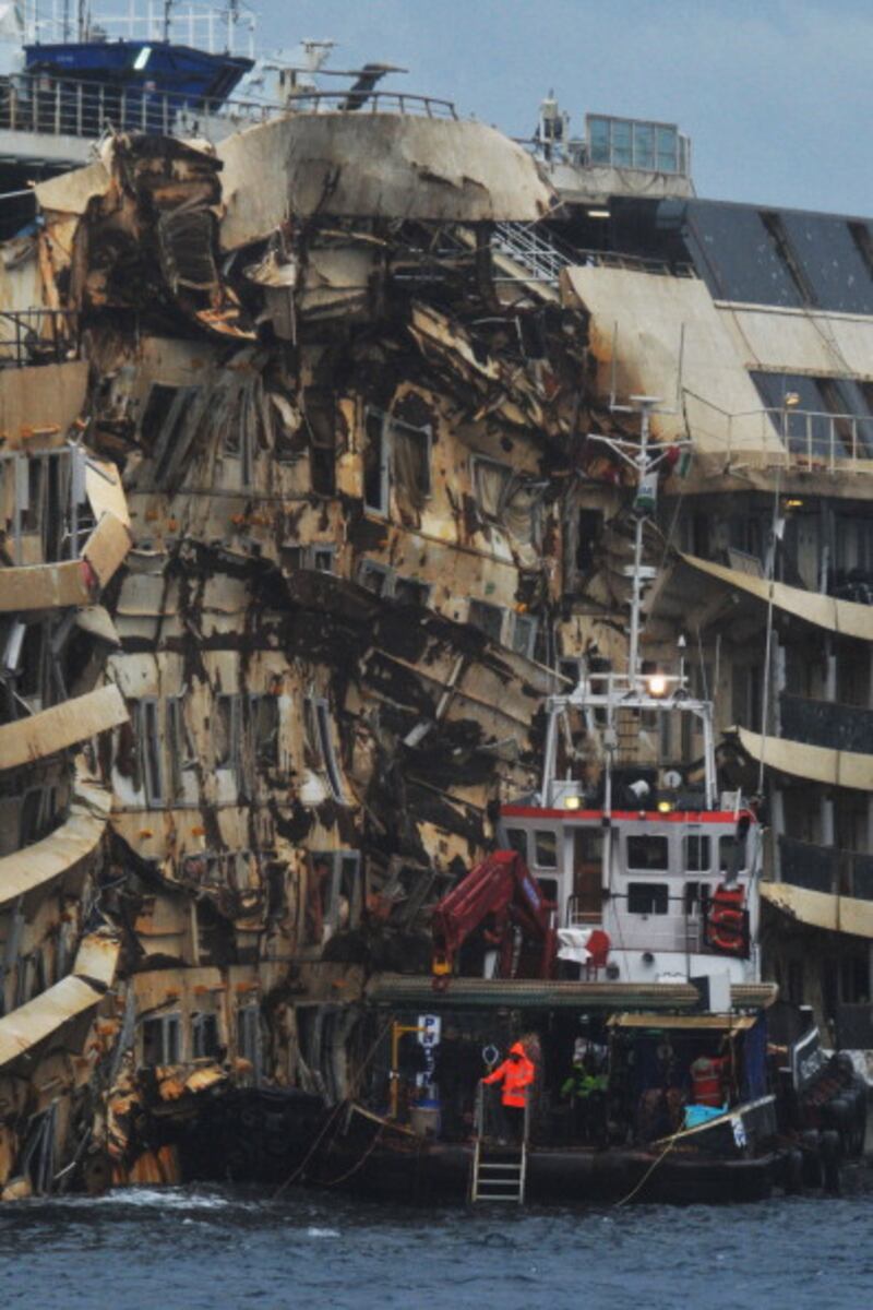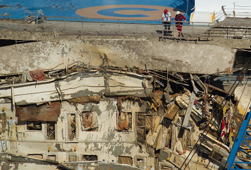 10 years later A team of experts go to inspect the wreck of the ship Costa Concordia on January 23, 2014 in Isola del Giglio, Italy. Today, for the first time since the ship's fatal 2012 accident, a delegation will board the vessel to collect new evidence, among the areas of interest will be the ship's bridge and the on-board elevators with the emergency generator which failed the night of the crash to be inspected on February 27th. (Photo by Laura Lezza/Getty Images) (Laura Lezza/Getty Images)
