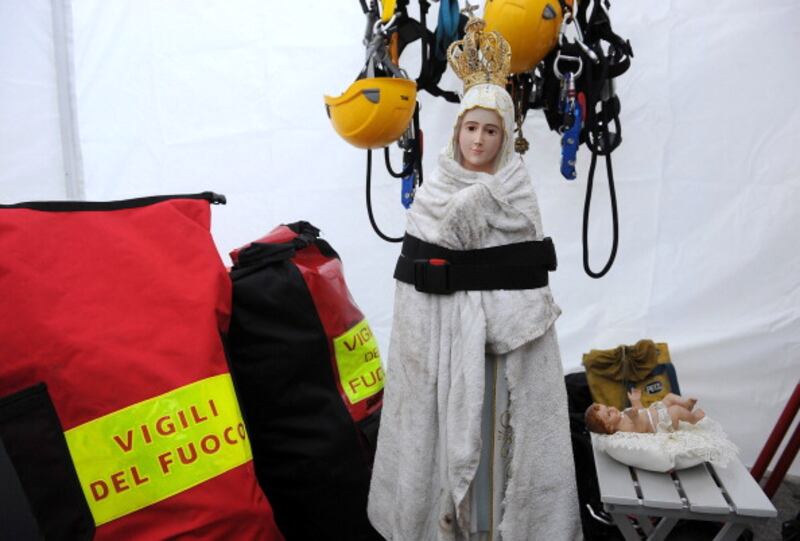 10 years later Statues of Madonna and Jesus are kept by firefighters in storage after they were recovered from a chapel onboard the Cruise ship Costa Concordia as it lies stricken off the shore of the island of Giglio on January 20, 2012 in Giglio Porto, Italy. Explosives have been used to gain access to previously unreachable parts of the vessel, in a bid to find survivors. (Photo by Tullio M. Puglia/Getty Images) (Tullio M. Puglia/Getty Images)