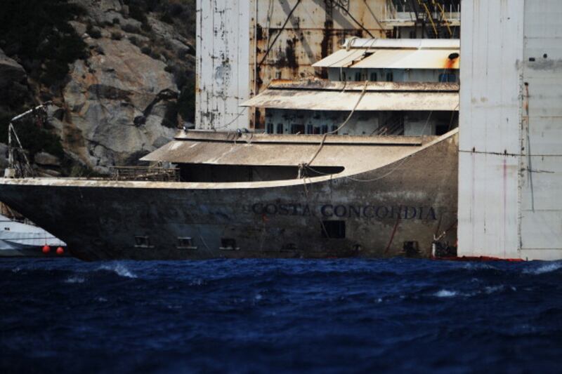 10 years later The severely damaged side of the stricken Costa Concordia is visible after the parbuckling salvage operation successfully uprighted the ship at around 4 am on September 17, 2013 in Isola del Giglio, Italy. Work began yesterday to right the stricken Costa Concordia vessel, which sank on January 12, 2012. If the operation is successful, it will then be towed away and scrapped. The procedure, known as parbuckling, has never been carried out on a vessel as large as Costa Concordia before. (Photo by Marco Secchi/Getty Images) (Marco Secchi/Getty Images)