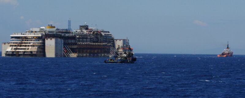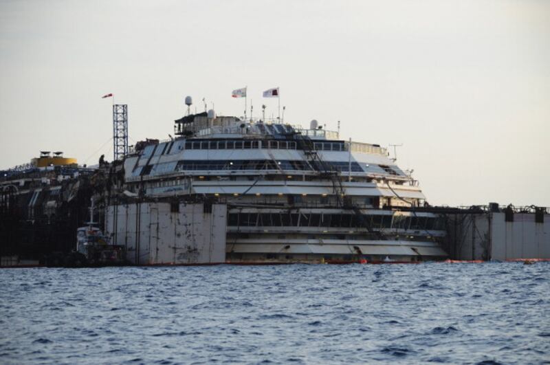 10 years later The wrecked cruise ship Costa Concordia is towed by tugs from Giglio in the open sea after being refloated, on July 23, 2014 in Isola del Giglio, Italy. The ship is bound for its homeport of Genoa where it will be dismantled. The Costa Concordia capsized at the island of Giglio in 2012 killing 32 passengers. (Photo by Laura Lezza/Getty Images) (Laura Lezza/Getty Images)