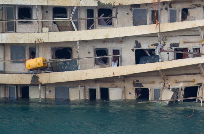 10 years later A view of the bow of the wreckage of the Costa Concordia on September 14, 2013 in Isola del Giglio, Italy. The Costa Concordia is reportedly due to be righted beginning on the morning of September 16, then, if the operation is successful, it will be towed away and scrapped. (Photo by Marco Secchi/Getty Images) (Marco Secchi/Getty Images)