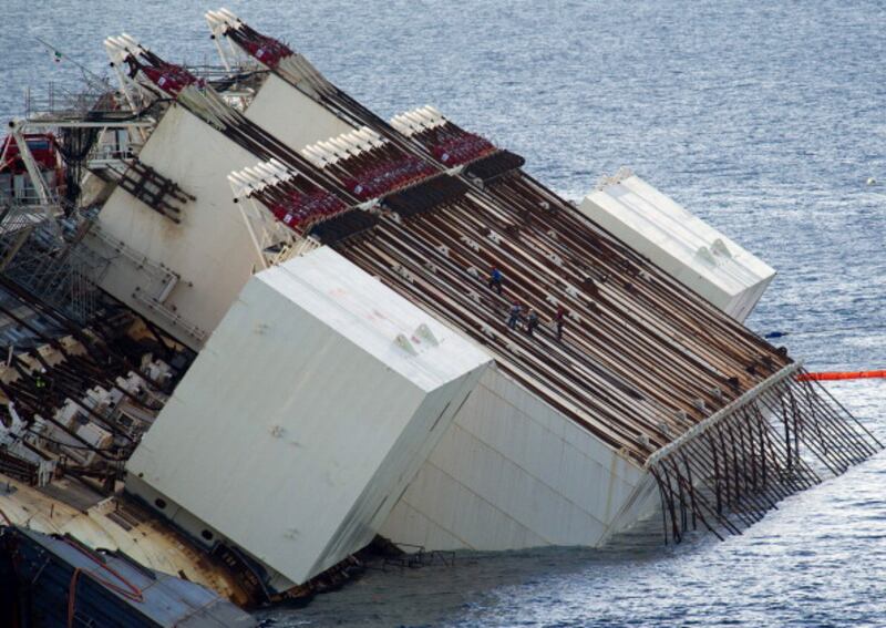 10 years later Engineers start to inspect the Costa Concordia after the righting operation on September 18, 2013 in Isola del Giglio, Italy. The vessel, which sank on January 12, 2012, was successfully righted during a painstaking operation yesterday morning. The ship will eventually be towed away and scrapped. It was the first time the procedure, known as parbuckling, had been carried out on a vessel as large as Costa Concordia. (Photo by Marco Secchi/Getty Images) (Marco Secchi/Getty Images)