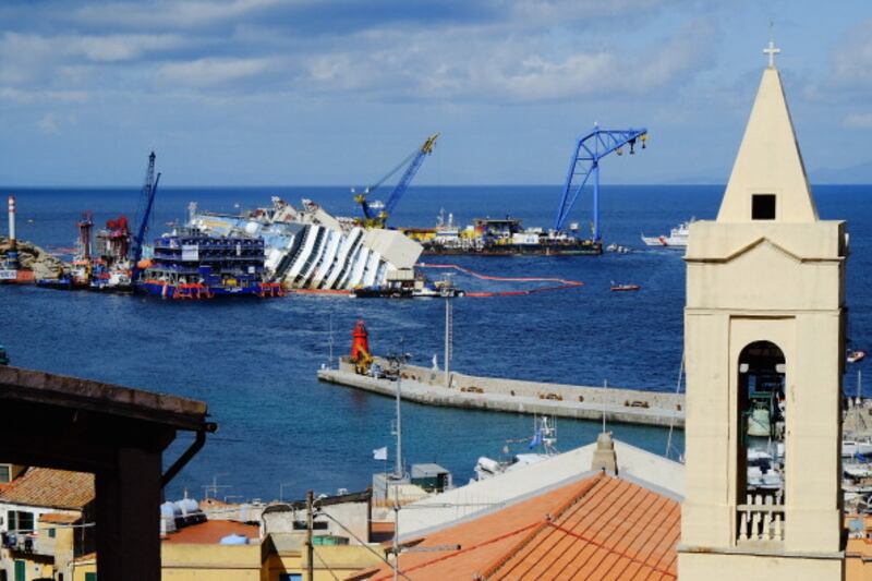 10 years later The wrecked ship Costa Concordia is seen during the refloating operations on July 14, 2014 in Isola del Giglio, Italy. On the first day of the operation, the wreck will be partially refloated by 2 meters from the platforms that support it and will then be moved approximately 30 meters to the east. The wreck will be held in position by tugs and moored by anchors with steel cables. The refloating operation is expected to take up to a week before the wreck is towed to the port of Genoa for dismantling. (Photo by Laura Lezza/Getty Images) (Laura Lezza/Getty Images)