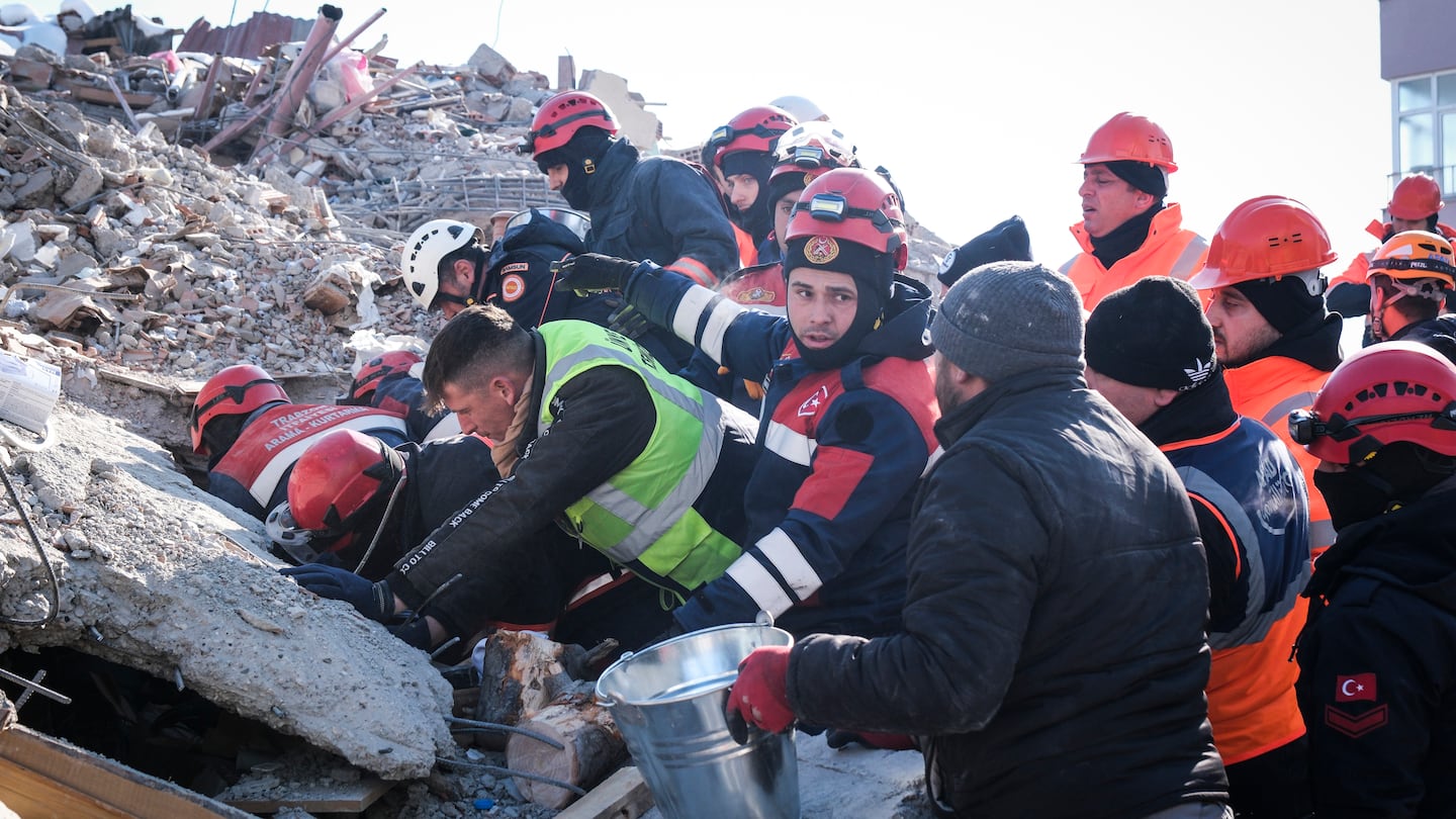 Thousands Dead After Earthquake Hits Turkey And Syria HATAY, TURKEY - FEBRUARY 09: Rescuers work at the site of a collapsed building on February 09, 2023 in Hatay, Turkey. A 7.8-magnitude earthquake hit near Gaziantep, Turkey, in the early hours of Monday, followed by another 7.5-magnitude tremor just after midday. The quakes caused widespread destruction in southern Turkey and northern Syria and were felt in nearby countries. (Photo by Burak Kara/Getty Images) (Burak Kara/Getty Images)