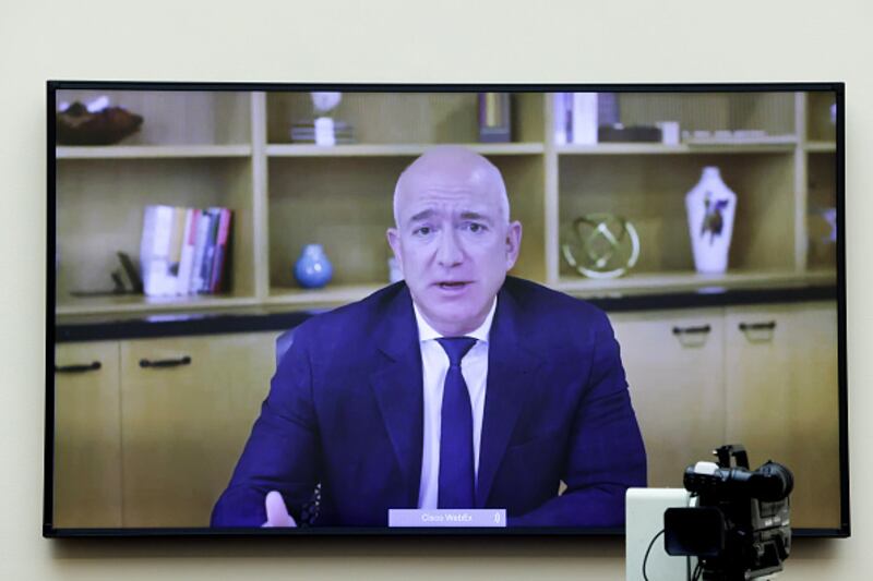 Through the years Amazon CEO Jeff Bezos testifies via video conference during the House Judiciary Subcommittee on Antitrust, Commercial and Administrative Law hearing on Online Platforms and Market Power in the Rayburn House office Building, July 29, 2020 on Capitol Hill in Washington, DC. The committee was scheduled to hear testimony from the CEOs of Apple, Facebook, Amazon and Google. (Photo by Graeme Jennings-Pool/Getty Images) (Graeme Jennings/Washington Examiner/Getty Images)