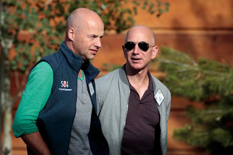 Through the years (L-R) Jeff Bezos, chief executive officer of Amazon, and John Elkann, chairman of Fiat Chrysler Automobiles, walk together during the annual Allen & Company Sun Valley Conference, July 12, 2018 in Sun Valley, Idaho. Every July, some of the world's most wealthy and powerful businesspeople from the media, finance, technology and political spheres converge at the Sun Valley Resort for the exclusive week-long conference. (Photo by Drew Angerer/Getty Images) (Drew Angerer/Getty Images)