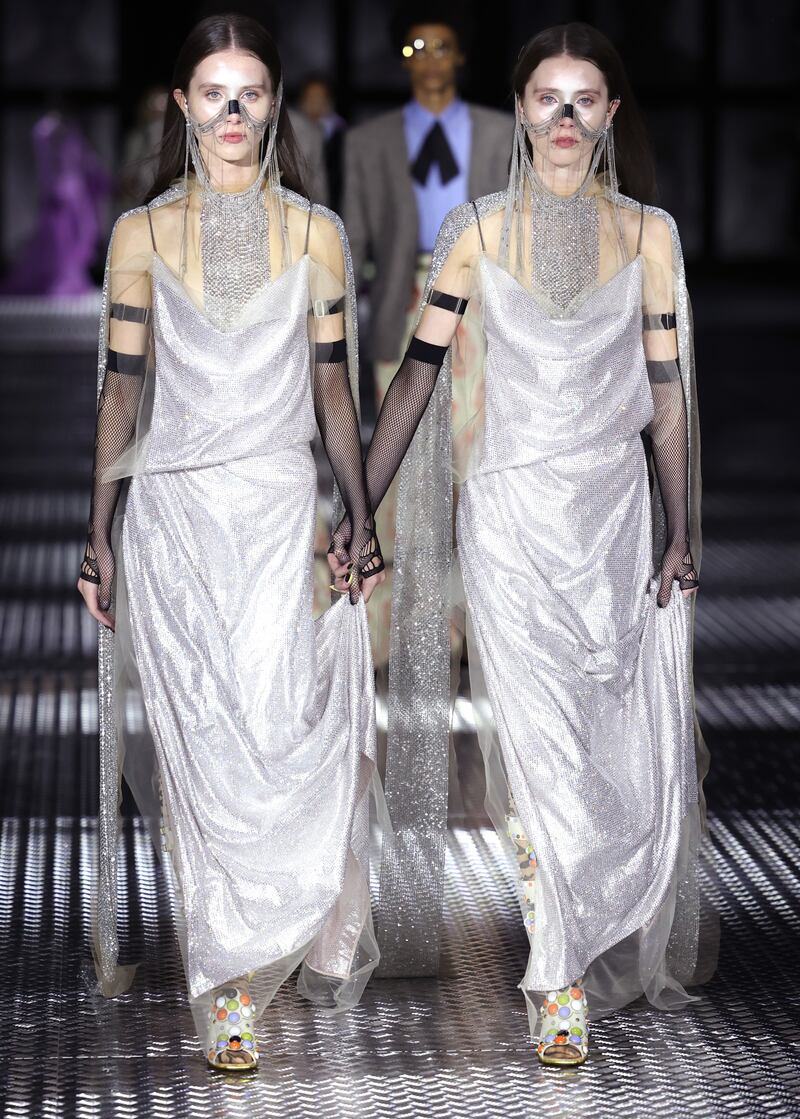 Michele, Gucci’s creative director, had a stage constructed with a secret reveal. According to The Associated Press, he staged side-by-side shows inside the Gucci Hub, each unbeknownst to the other, until a wall lifted, revealing sets of twins in similar looks in synchronic stride.