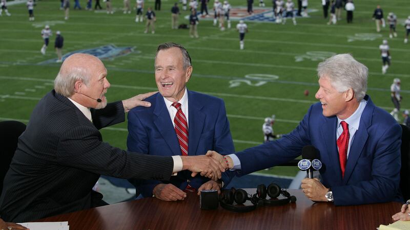2005 FOX Sportscaster Terry Bradshaw speaks with former U.S. Presidents George Bush and Bill Clinton in the FOX Broadcast booth during the XXXIX Superbowl pregame show at Alltel Stadium on February 6, 2005 in Jacksonville, Florida. (Frank Micelotta/Getty Images)