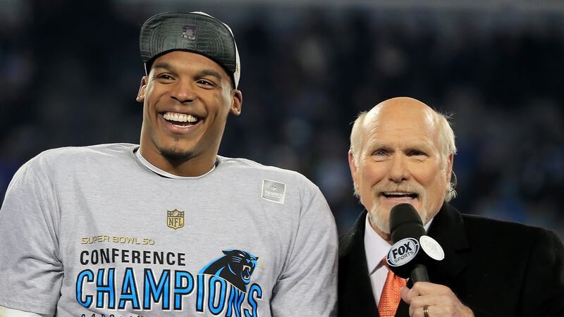 2016 Cam Newton #1 of the Carolina Panthers reacts as he is interviewed by Terry Bradshaw after defeating the Arizona Cardinals with a score of 49 to 15 in the NFC Championship Game at Bank of America Stadium on January 24, 2016 in Charlotte, North Carolina. (Mike Ehrmann/Getty Images)