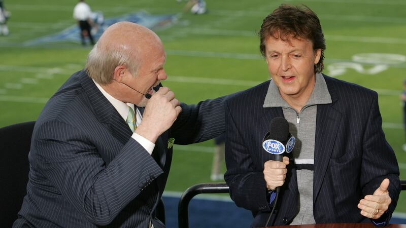 2005 (L-R) FOX Sportscaster Terry Bradshaw speaks with musician Paul McCartney in the FOX Broadcast booth during the XXXIX Superbowl pregame show at Alltel Stadium on February 6, 2005 in Jacksonville, Florida. (Photo by Frank Micelotta/Getty Images) (Frank Micelotta/Getty Images)