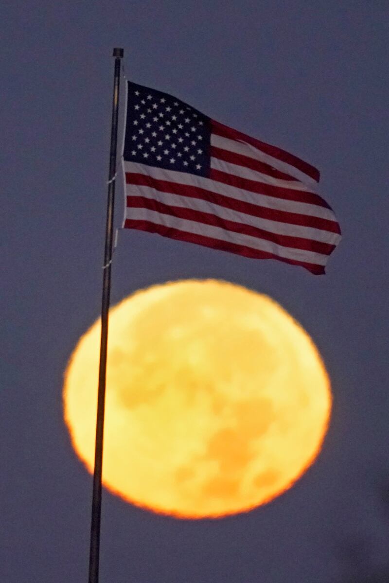 Photos: Halloween Blue Moon brightens the night sky The full blue moon sets beyond an American flag Saturday, Oct. 31, 2020, in Kansas City, Mo. (AP Photo/Charlie Riedel)