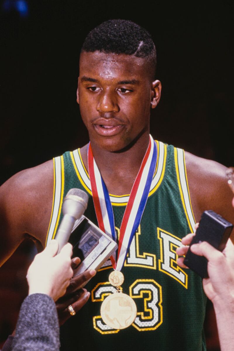 Through the years Shaquille O'Neal #33, Center for the Cole High School Cougars basketball team talks to the media after being awarded the State Tournament Star medal following the Cougars win in the Class 3A state basketball championship on 2nd March 1989 at the Steinke Event Center at Texas A&I University in Kingsville, Texas, United States. (Photo by Allsport/Getty Images) (Getty Images/Getty Images)