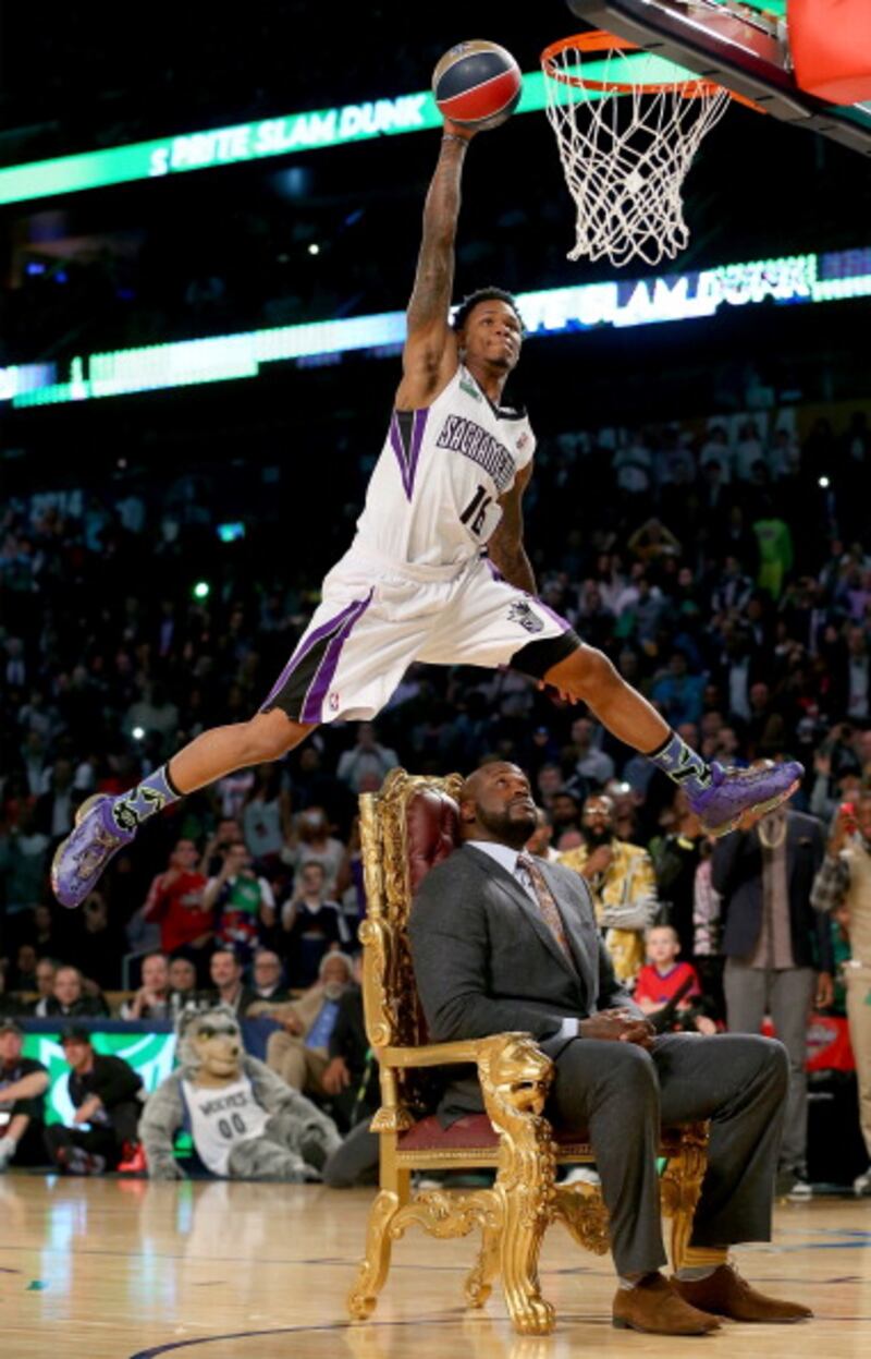 Through the years Western Conference All-Star Ben McLemore #16 of the Sacramento Kings dunks the ball over Shaquille O'Neal during the Sprite Slam Dunk Contest 2014 as part of the 2014 NBA All-Star Weekend at the Smoothie King Center on February 15, 2014 in New Orleans, Louisiana. (Photo by Ronald Martinez/Getty Images) (Ronald Martinez/Getty Images)