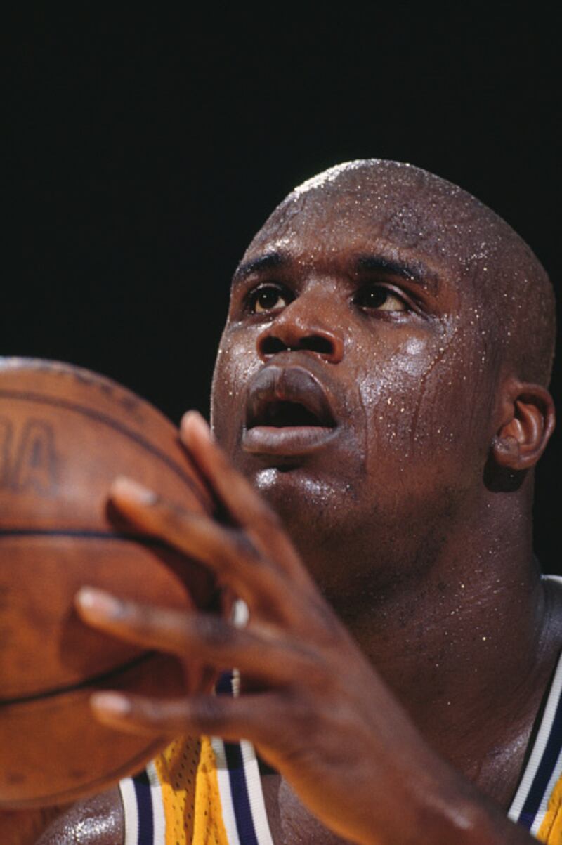 Through the years Shaquille O'Neal #34, Center for the Los Angeles Lakers prepares to shoot a free throw during the NBA Pacific Division basketball game against the Sacramento Kings on 17th April 1997 at the Great Western Forum arena in Inglewood, Los Angeles, California, United States. The Lakers won the game 108 - 99. (Photo by Jed Jacobsohn/Allsport/Getty Images) (Jed Jacobsohn/Getty Images)