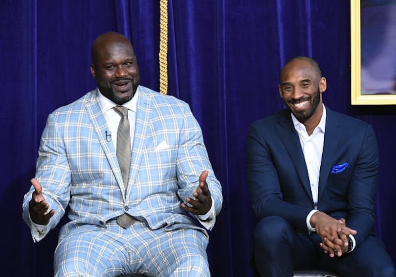 Through the years Former Los Angeles Lakers player Shaquille O'Neal reacts to his former players seated in the audience with Kobe Bryant looking on during the unveiling of his statue at Staples Center March 24, 2017, in Los Angeles, California. (Photo by Kevork Djansezian/Getty Images) (Kevork Djansezian/Getty Images)