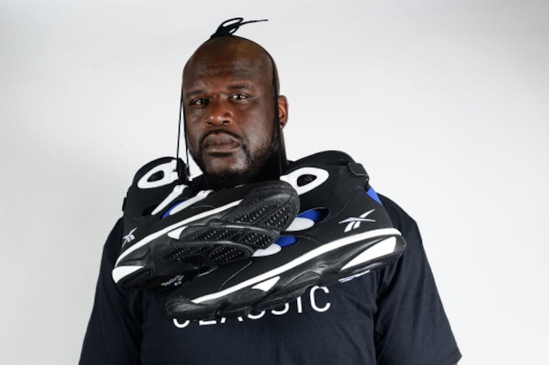 Through the years NBA basketball player Shaquille O'Neal poses with Reebok sneakers at the Reebok Classic Breakout at Philadelphia University on July 9, 2014 in Philadelphia, Pennsylvania. (Photo by Lisa Lake/Getty Images for Reebok) (Lisa Lake/Getty Images for Reebok)