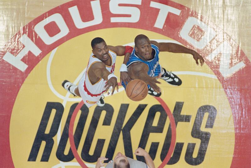 Through the years Hakeem Olajuwon of the Houston Rockets of the Western Conference contests the ball at the tip off against Shaquille O'Neal of the Orlando Magic of the Eastern Conference during game 4 of the National Basketball Association Finals game on 14 June 1995 at The Summit, Houston, Texas, United States. Visions of Sport. (Photo by Allsport/Getty Images) (Getty Images/Getty Images)