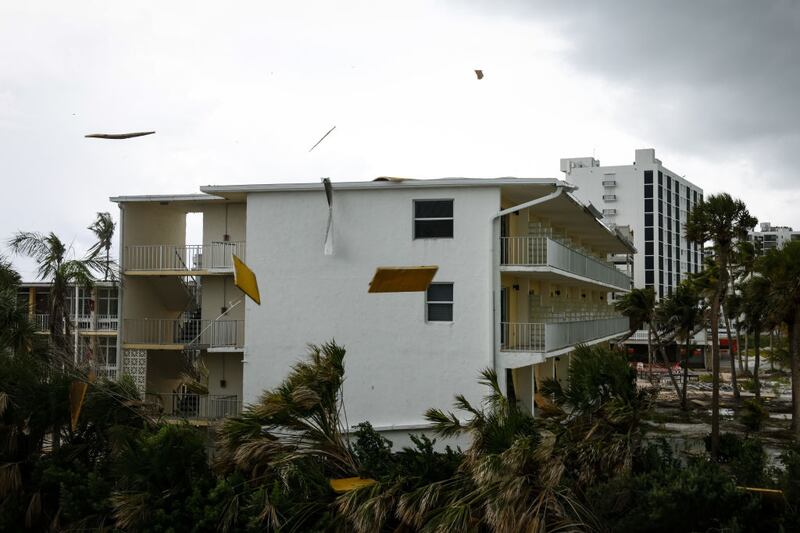 Idalia impact: Debris flies off a roof ahead of Hurricane Idalia in Fort Myers on Tuesday. (Bloomberg/Bloomberg via Getty Images)