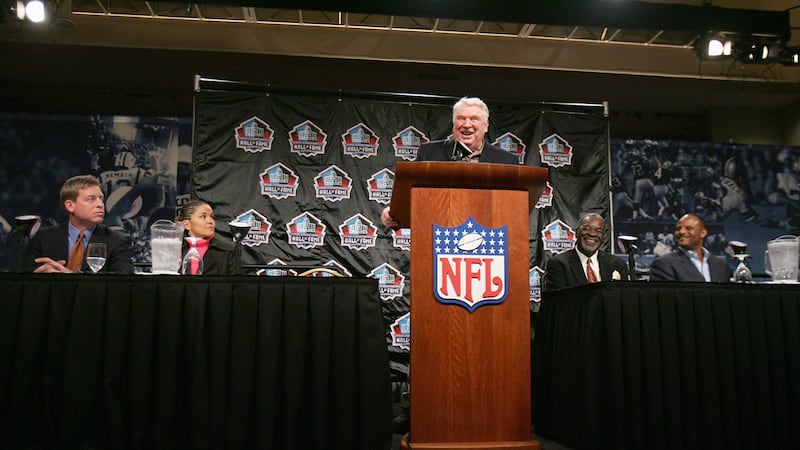 John Madden through the years 2006: Broadcaster and former coach John Madden speaks at a press conference as other members of the NFL Hall of Fame 2006 electees including (L-R) Troy Aikman, Sara White, widow of Reggie White, Rayfield Wright and Warren Moon listen February 4, 2006 at the Renaissance Center in Detroit, Michigan. (Photo by Jonathan Daniel/Getty Images, File) (Jonathan Daniel/Getty Images)