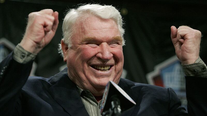 John Madden through the years 2016: Former Oakland Raiders head coach John Madden wearing his Hall of Fame Jacket speaks to the fans during the unveiling of the Hall of Fame busts for former Raider and teammate Ken Stabler at halftime of an NFL game between the Atlanta Falcons and Oakland Raiders at the Oakland-Alameda County Coliseum on September 18, 2016 in Oakland, California. (Thearon W. Henderson/Getty Images, File)