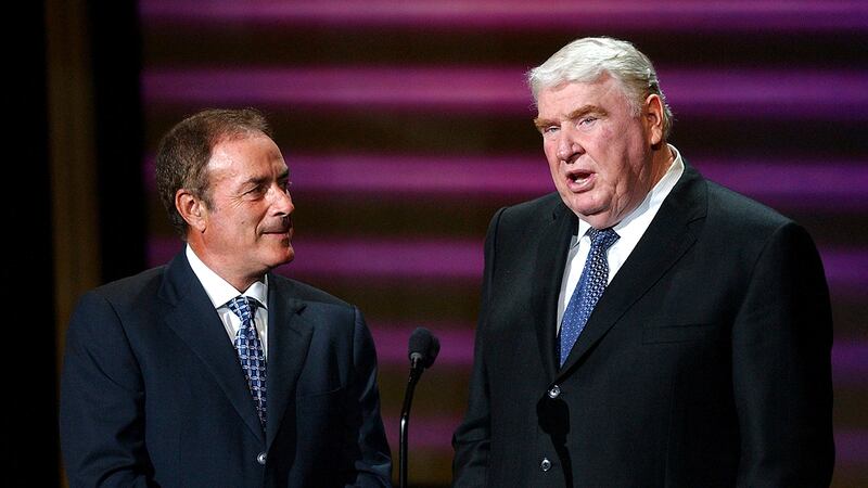 John Madden through the years 2002: Pat Summerall (left) and John Madden in the broadcast booth together for the last time at Super Bowl XXXVI at the Louisiana Superdome in New Orleans, on Feb. 3, 2002. (Frank Micelotta Archive/ImageDirect via Getty Images, File)