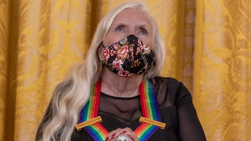 Joni Mitchell through the years 2021: Singer Joni Mitchell attends a reception for Kennedy Center honorees hosted by President Joe Biden and first lady Dr. Jill Biden in the East Room at the White House on Dec, 5, 2021, in Washington, DC. The reception at the White House was held ahead of the Kennedy Center Honors in Washington. (Tasos Katopodis/Getty Images, File)