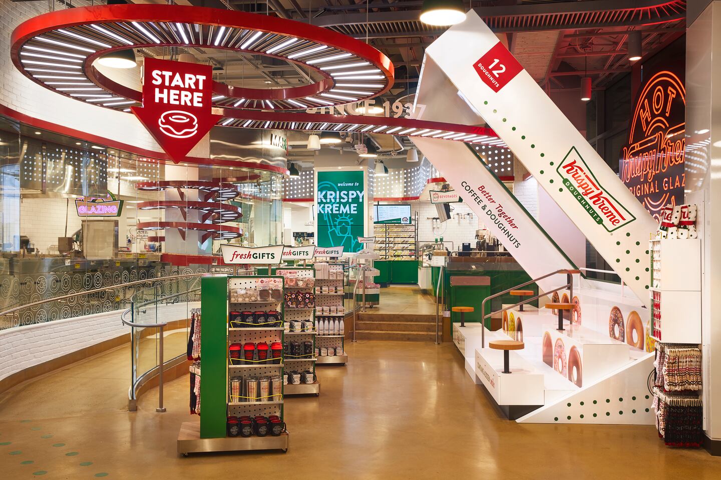 Customers can expect to see the world’s largest signature Hot Light, a doughnut-making theater that produces 4,560 doughnuts an hour and stadium‑style seating inside a faux Krispy Kreme dozens box.